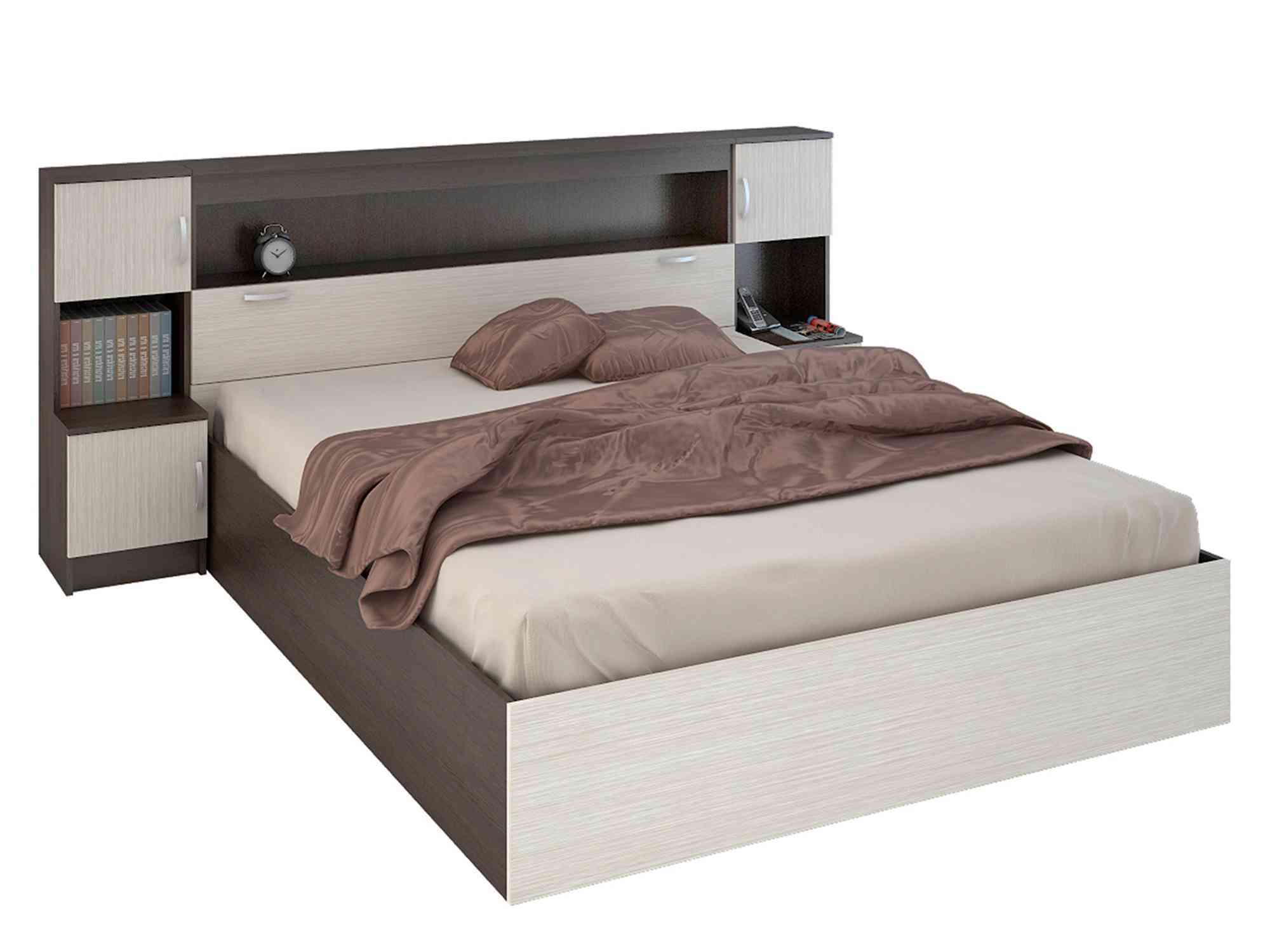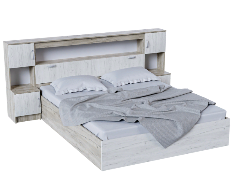 Кровать Бася КР 552 с закраватным модулем — это не только комфортное и просторное спальное место, но и целая система хранения, которая включает в себя две прикроватные тумбочки, несколько закрытых полок и три открытые ниши.