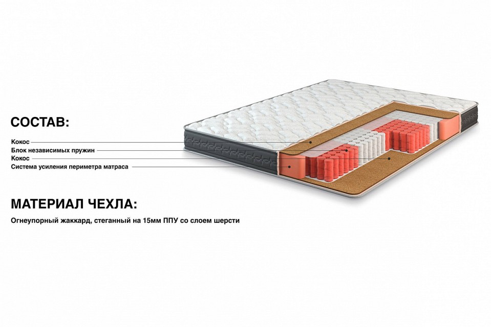 Матрас равномерно распределяет нагрузку и обеспечивает выраженную поддержку позвоночника. Прекрасно вентилируется благодаря двум слоям натуральной кокосовой койры. Шерстипон — современный материал, на основе синтепона с добавлением натуральной шерсти. Этот материал придает матрасу дополнительную мягкость и комфорт. Рекомендовано использование вместе с защитным чехлом Aquastop. Подходит для кроватей с подъемным механизмом. Состав слоев:, кокос, блок независимых пружин (256 шт/м.кв), кокос, система усиления периметра матраса.
