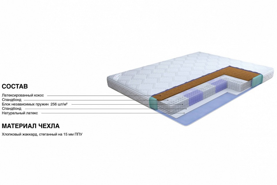 Наполнитель: кокос, латекс натуральный, спанбонд, независимые пружины (256 шт/м.кв)