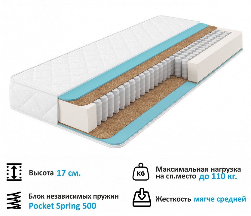 Дополнительные параметры: состав слоев:, классический несъемный чехол жаккард стеганый на синтепоне, ППУ — 15 мм (с каждой стороны), настил из усиленного кокосового волокна — 5 мм (с каждой стороны), блок независимых пружин Pocket Spring 500 шт на спальное место — 120 мм