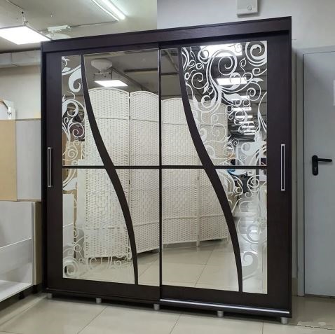 Зеркальный фасад шкафа, украшенный витиеватым рисунком, напоминающим зимние узоры на стекле, придает модели романтизм и легкость.