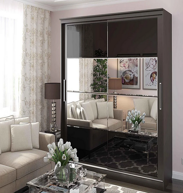 Наполнение: платяной отдел со штангой для вешалок, бельевые и антресольные полки, два выдвижных ящичка. Оборудован двумя раздвижными створками, на фасадах которых размещаются примерочные зеркала.