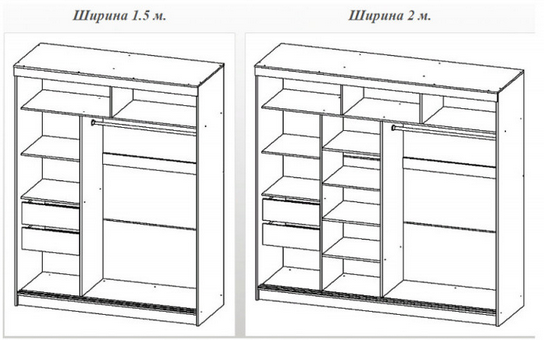 Наполнение шкафа — антресольные полки, полки для белья, два компактных выдвижных ящичка для мелочей, штанга для одежды и штанга для брюк и рубашек.