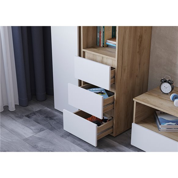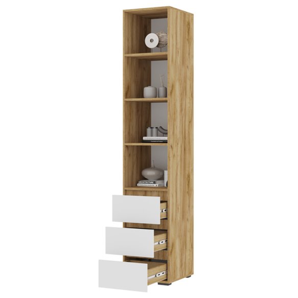 Шкаф-пенал Хелен 02 имеет форму высокого и узкого шкафа. Он отлично вольется в интерьер гостиной, детской или спальной комнаты и предназначен для хранения вещей. Шкаф состоит из трех выдвижных полок снизу и четырех открытых полок, на которых вы можете расположить книги, фотографии или декоративные предметы интерьера.