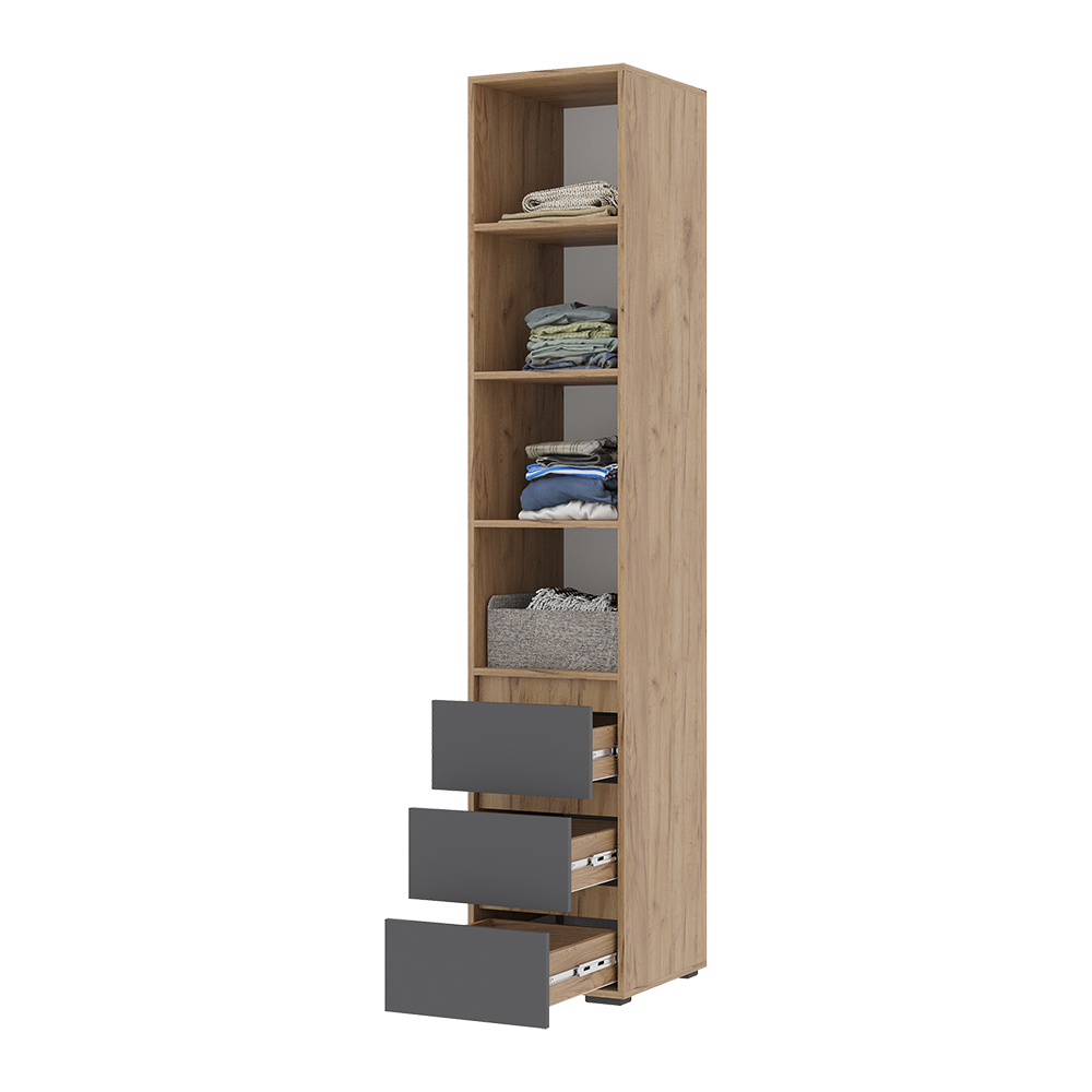 Шкаф-пенал Хелен 03 имеет форму высокого и узкого шкафа. Он превосходно подойдет для комплектации мебельной обстановки гостиной, детской или спальной комнаты. Он предназначен для организации хранения вещей и состоит из трех выдвижных полок снизу и закрытой пенальной секцией с четырьмя полками за распашной дверью.