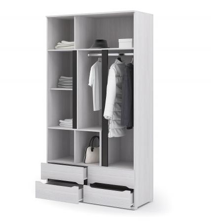 Модель представляет собой трехстворчатую конструкцию, оборудованную дополнительно выдвижными ящиками для более удобной эксплуатации изделия и организации порядка в вещах.
