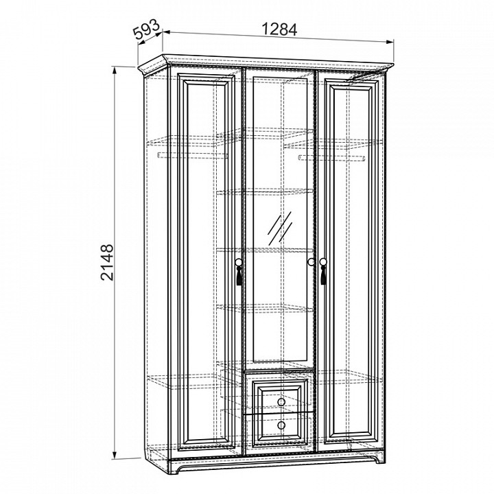 Компоненты, входящие в комплект: 2 штанги для вешалок, 2 ящика, 3 дверцы, 8 полок