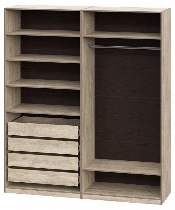 Компоненты, входящие в комплект: 1 штанга для вешалок, 2 шкафа — 1000х554х2300 мм, 4 ящика — 968х524х16 мм, 6 полок — 968х554х16 мм