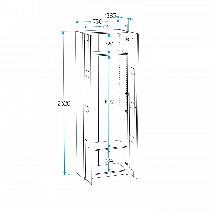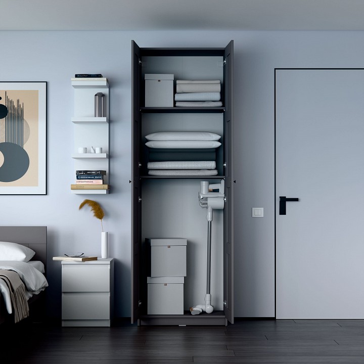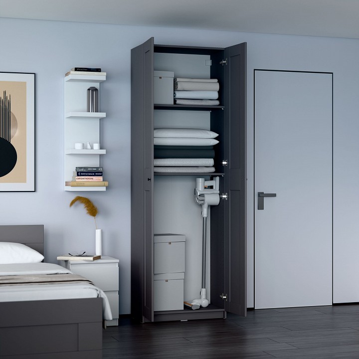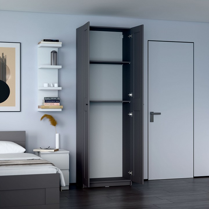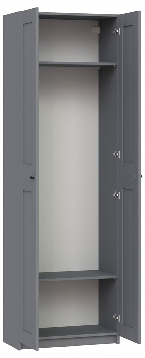 Шкаф МАКС для одежды двухдверный, 750х380х2330, цвет серый. Укомлектован двумя полками . Изготовлен из кашированного ДСП толщиной 18 мм. Крепится к стене. Гарантийный срок для жилых помещений 24 месяца, для общественных помещений — 18 месяцев.