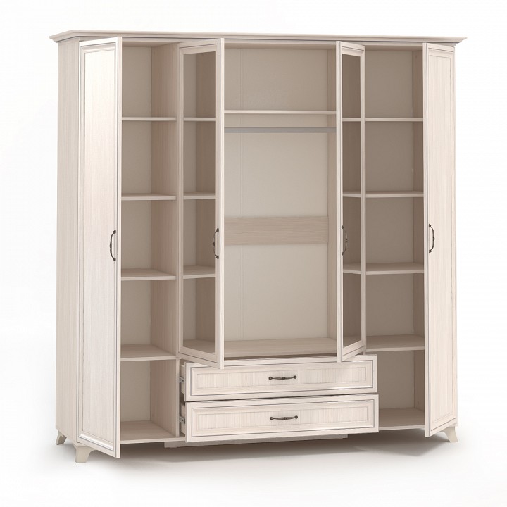 Компоненты, входящие в комплект: 1 штанга для вешалок, 2 ящика, 4 дверцы, 9 полок