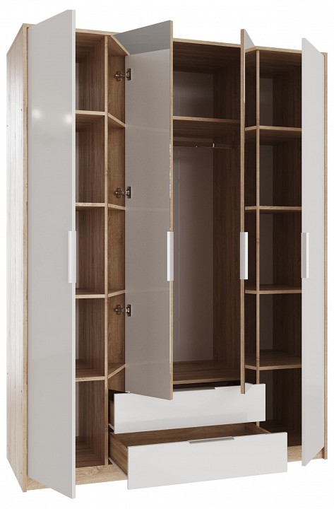 Компоненты, входящие в комплект: 1 штанга для вешалок, 2 ящика, 4 дверцы, 9 полок