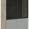 Шкаф для одежды Этна выполнен в трендовом декоре: комбинированные матовым стеклом фасады гармонично дополняют сложный древесный рисунок корпуса «дуб эндгрей» и визуально облегчают модуль. Наполнение шкафа – 2 стационарные штанги.