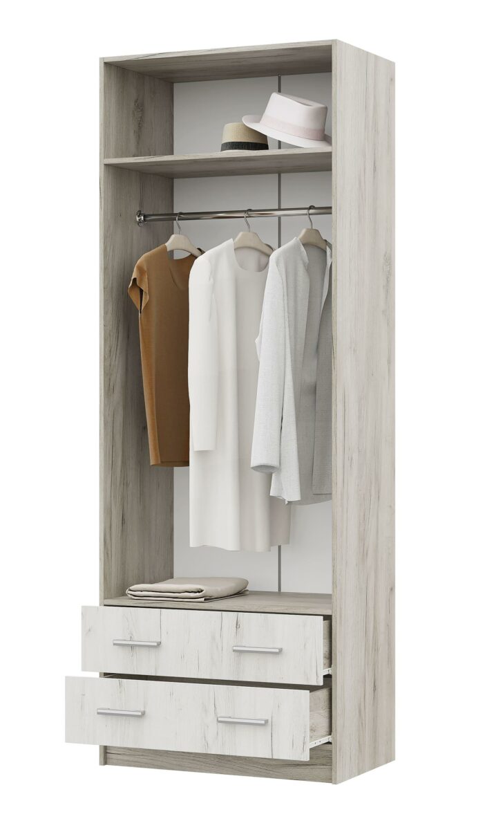 Антресольная полка и выдвижные ящики пригодятся для сложенной одежды, постельного и нижнего белья, разнообразных аксессуаров и коробок с обувью.