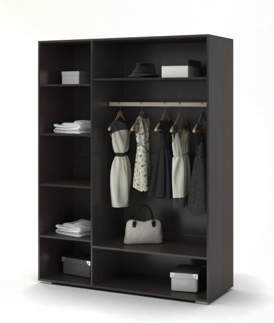 Внутри шкаф имеет два отсека — широкий снабжен штангой для вешалок-плечиков, верхней полкой для головных уборов и нижней для обуви.