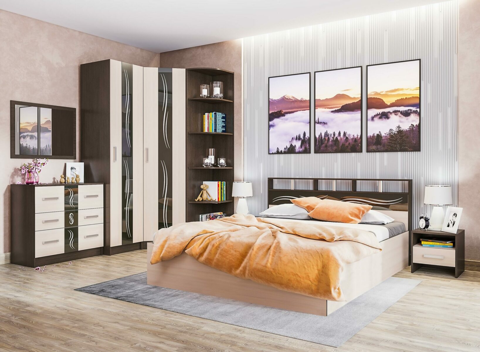 Фасады шкафов, комода и кроватей украшены накладками из стекла с зеркальным рисунком, нанесенным методом «Шелкография».