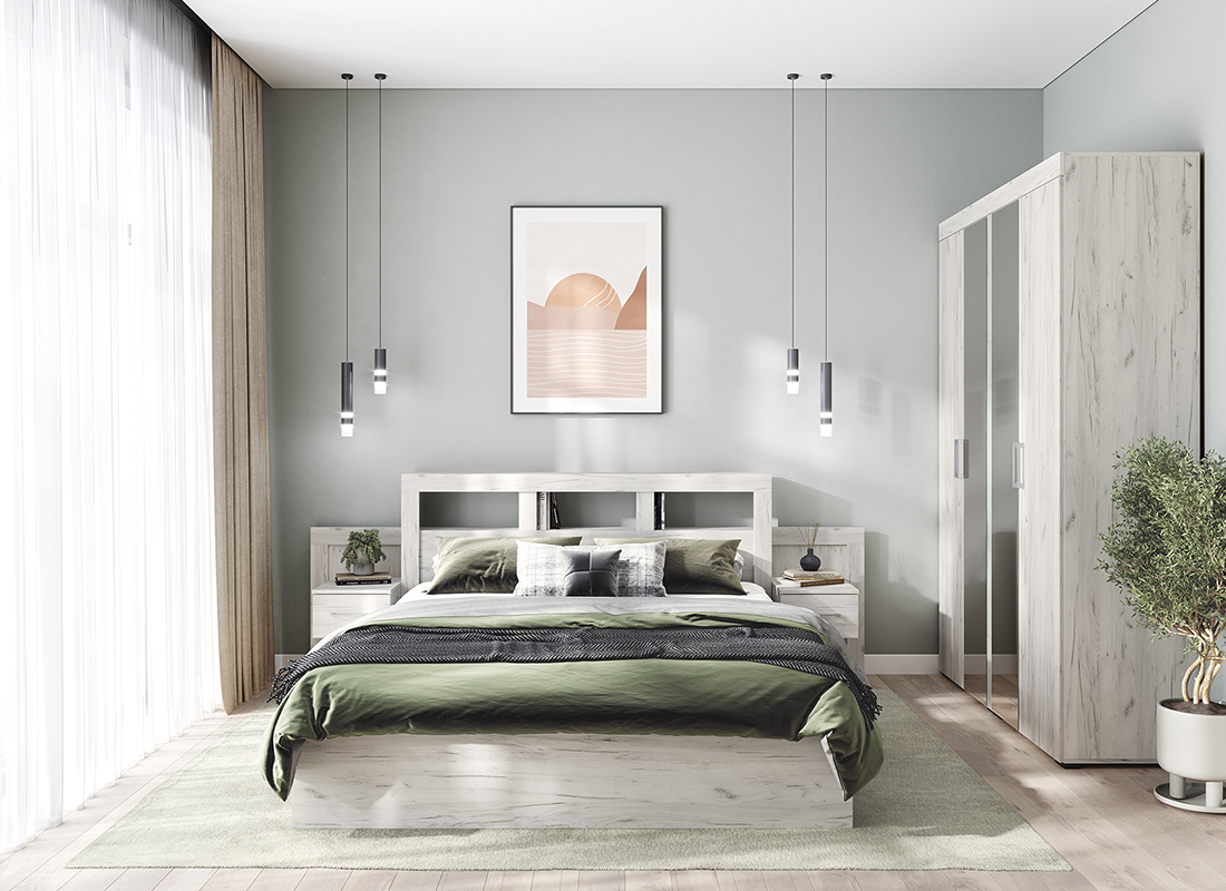 Прямолинейный дизайн мебели разработан в декоре «Крафт белый», напоминающий покрытое прозрачным слоем краски текстурное дерево.