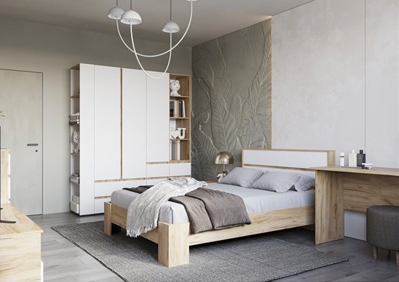 Спальня Хелен в цвете Дуб Крафт золотой/Белый шагрень придает чувство единения с природой, позволяет создать по-настоящему душевную атмосферу эко-стиля, для которого характерно наличие богатой цветовой палитры природных цветов в интерьере, дарящих ощущение тепла и спокойствия его счастливым обладателям.