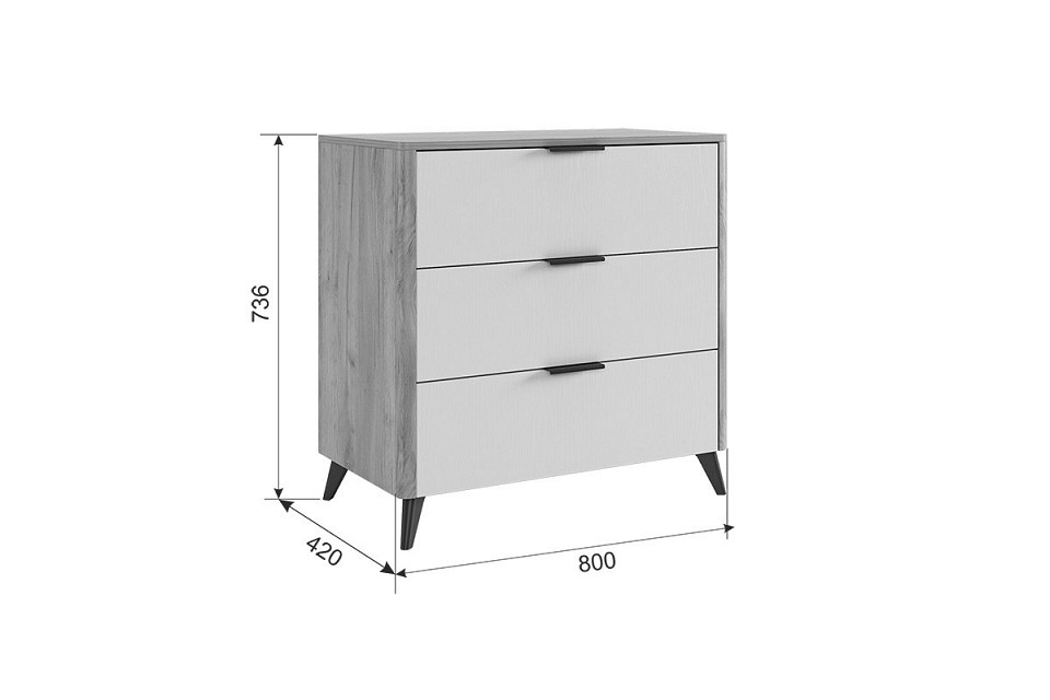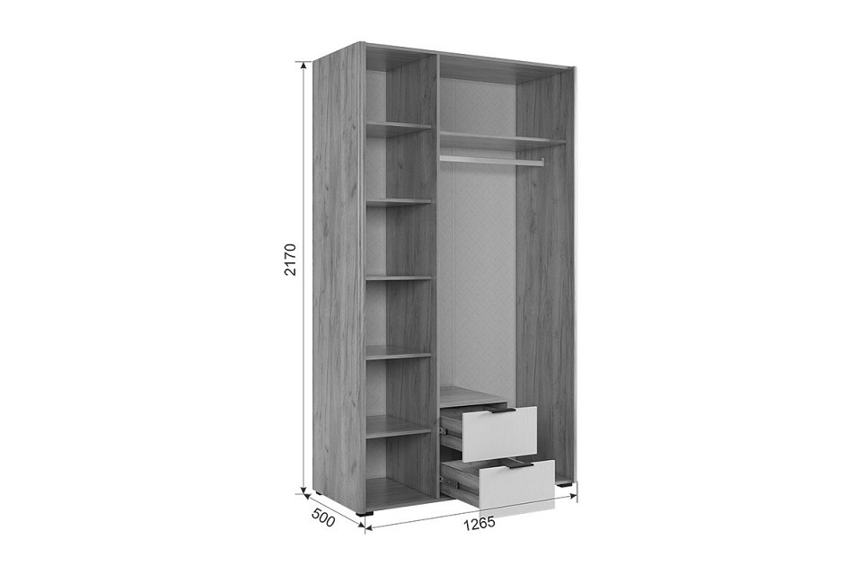Компоненты, входящие в комплект: комод — 800x420x736 мм, кровать двуспальная — 2074x1702x1005 мм, шкаф платяной — 1264x500x2170 мм 2 тумбочки — 464x401x450 мм