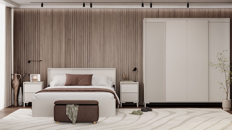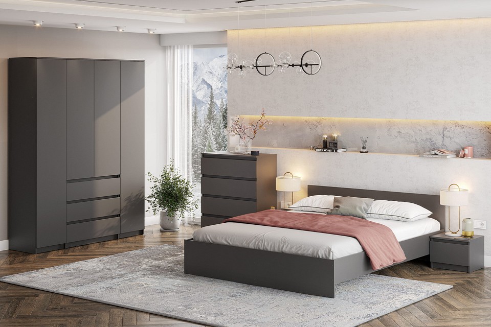 Компоненты, входящие в комплект: полка навесная — 1200x200x216 мм тумба под ТВ — 1600x608x419 мм 2 шкафа для белья — 400x418x2298 мм
