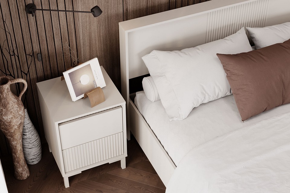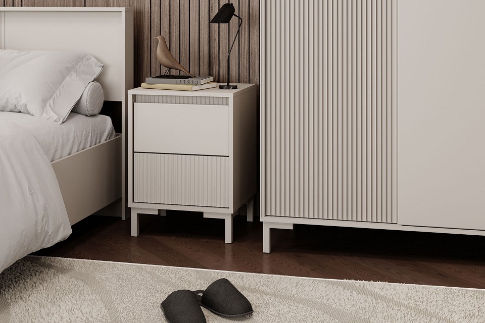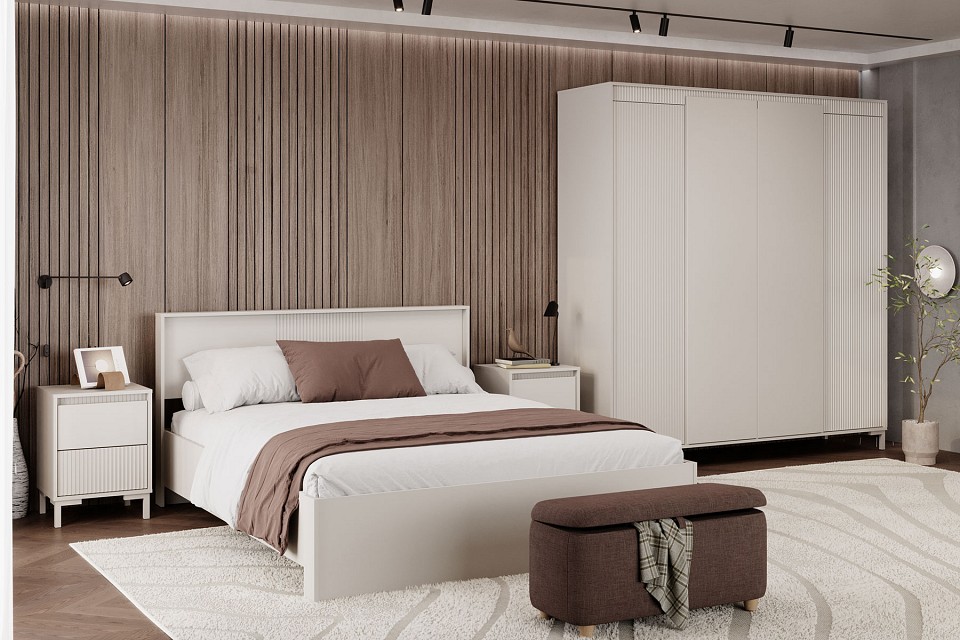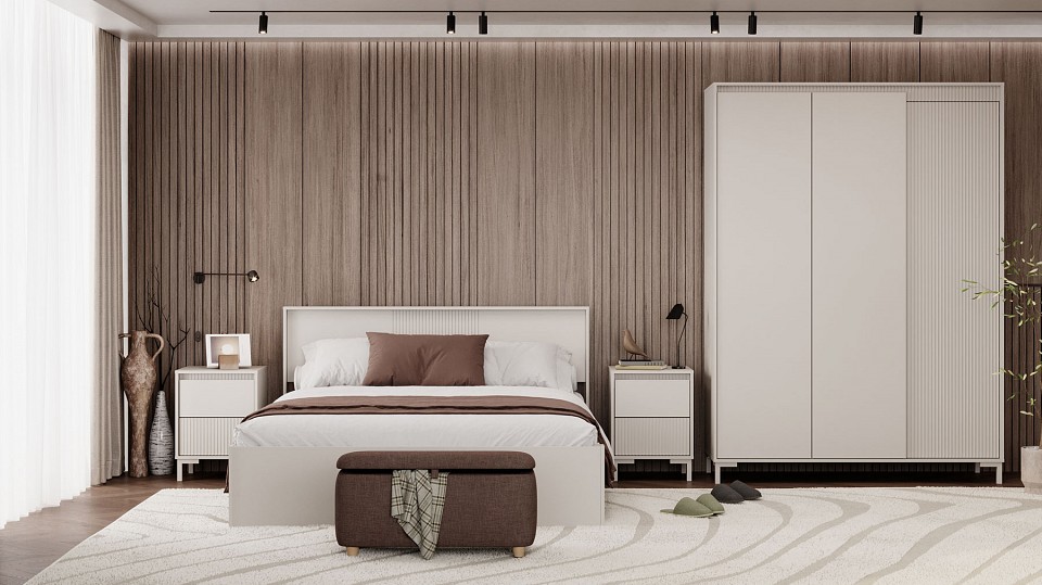 Компоненты, входящие в комплект: кровать двуспальная — 2083х1676х910 шкаф платяной — 2036х544х2137 2 тумбочки — 442х398х595