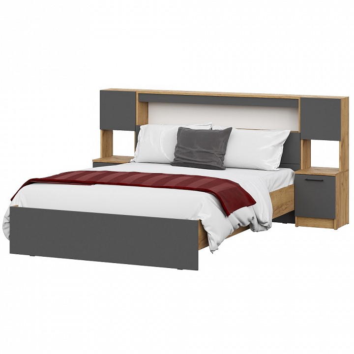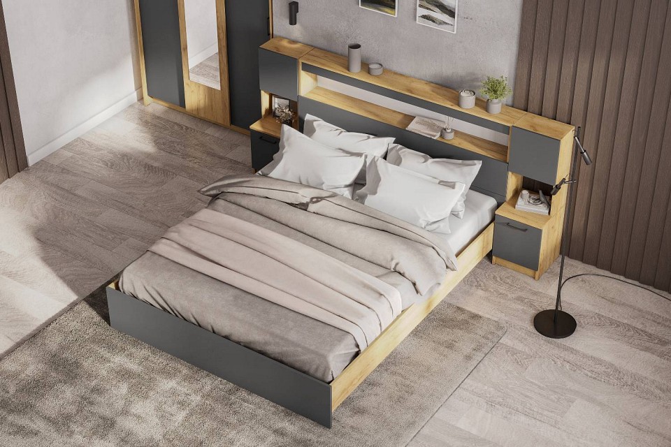 Компоненты, входящие в комплект: кровать с полками в изголовье и основанием — 2000х1600, комод, шкаф-купе, 2 тумбы прикроватные