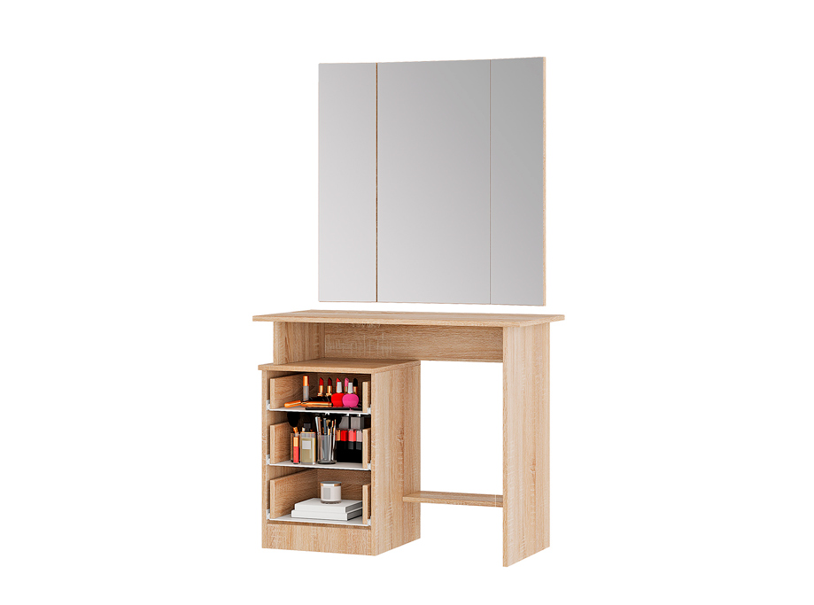 Косметический стол Сакура имеет три выкатных ящика, открытую полку для косметики и удобное зеркало, которое можно регулировать для удобства завершения своего образа.
