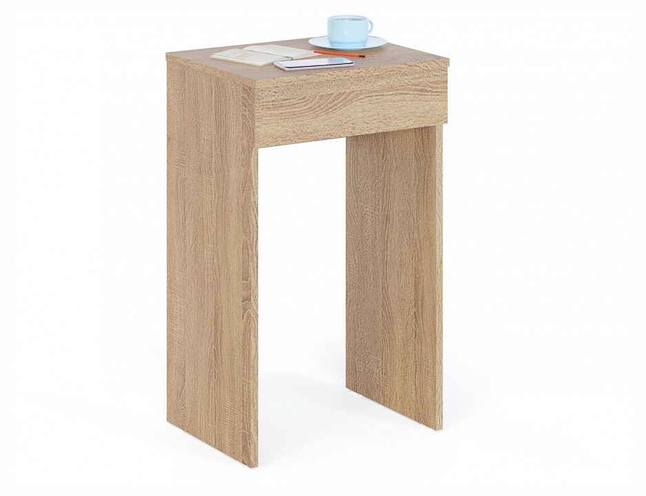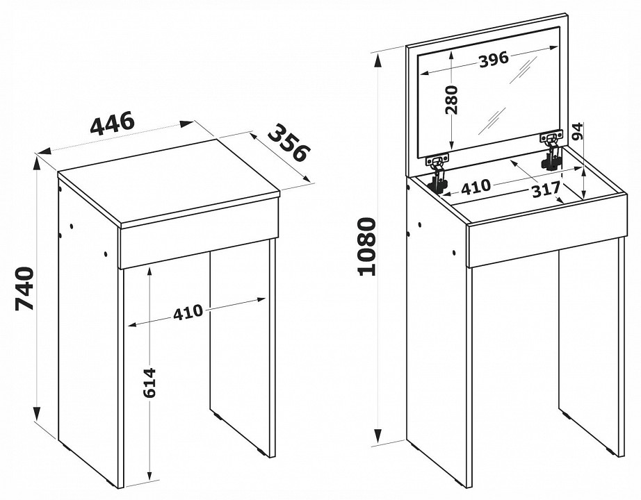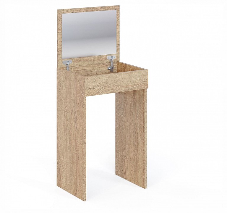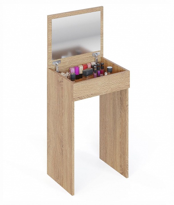Компактный стол для макияжа с откидной столешницей с зеркалом и местом для хранения косметики. Данная модель многофункциональна и с закрытой столешницей может использоваться как небольшой письменный стол, стол для ноутбука, детский стол или высокая прикроватная тумба в спальне.