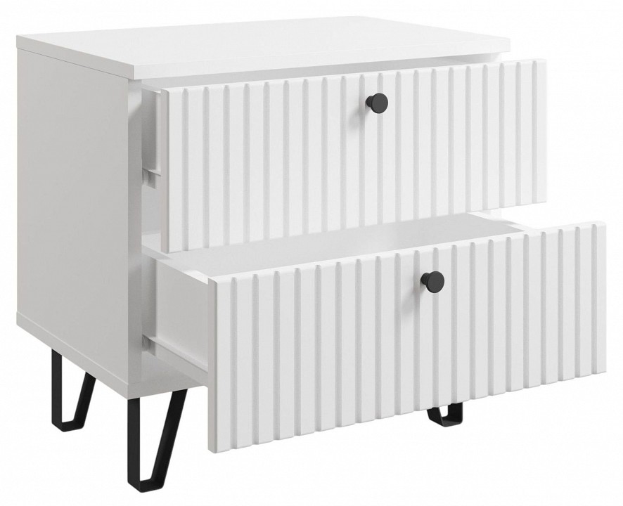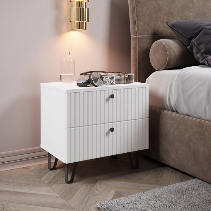 Тумба прикроватная с 2-мя ящиками в белом цвете и фрезеровкой по фасадам — идеальное решение для вашего интерьера. Простые формы легко впишутся в любой стиль помещения, а белый цвет придаст ему светлую и воздушную атмосферу. Металлические стильные ножки добавят современный шарм и легкость дизайну. Коллекция ‘Лайн’ — стильное и функциональное решение для хранения, создающее уютное пространство, которое будет радовать вас каждый день.