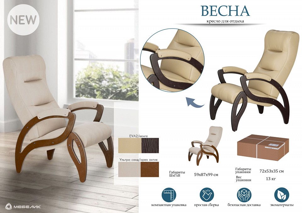 Сочетание традиционной конструкции каркаса, эргономичного сиденья и спинки, мягких подлокотников и подголовника делают эту модель максимально комфортной и уютной. Кресло для отдыха Весна Компакт прекрасно подойдёт как для дома или дачи, так и для офиса. Оно довольно компактное, поэтому с его помощью можно сэкономить пространство.