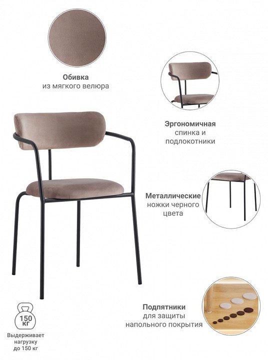 Кресла Ant будут отлично смотреться не только в гостиной, но и станут интересным решением для вашей спальни. Подойдут для кухни, а также для кафе и ресторанов с шикарным дизайном. Цвет обивки нейтрален, поэтому подойдет в качестве дополнения к любому интерьеру. Мягкая, приятная обивка из велюра на сиденье и спинке стула делает его еще более комфортным. Металлическое основание прочное и долговечное, оно способно выдержать вес до 150 кг.