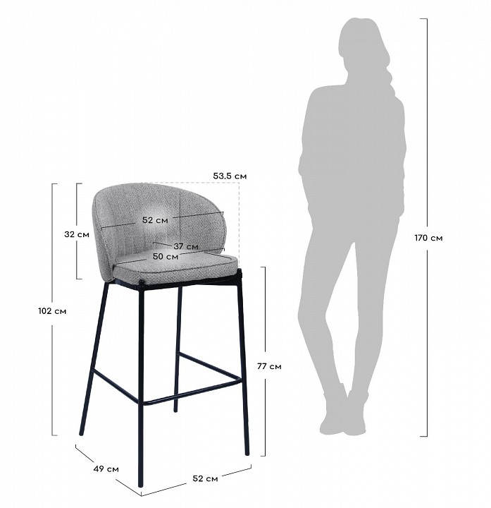 Дополнительные параметры: высота от пола до сиденья — 770 мм, глубина сиденья — 370 мм, ширина сиденья — 500 мм
