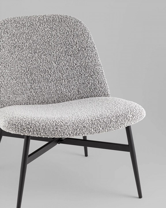 Обивка из букле, мягкая и тактильно приятная, создает уютную атмосферу и подчеркивает современный характер мебели. Металлический каркас и ножки в черном цвете обеспечивают прочность, стабильность и визуальный контраст. Спинка с наклоном и мягкое сиденье гарантируют удобство для отдыха или длительного пребывания. Лаконичные линии и отсутствие подлокотников придают стулу легкость и универсальность. Наклон спинки обеспечивает расслабленную посадку. Стул выдерживает нагрузку до 120 кг, сохраняя устойчивость и долговечность. Высота сиденья 40 см делает его удобным для пользователей любого роста. Дизайн стула выполнен в современном стиле с элементами скандинавского минимализма и лофта, что позволяет ему органично вписаться в любую обстановку.