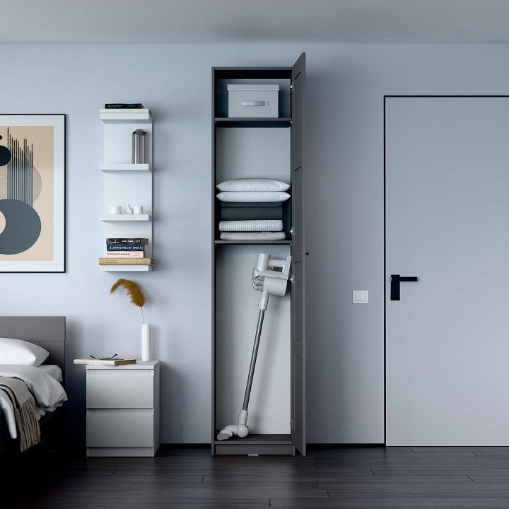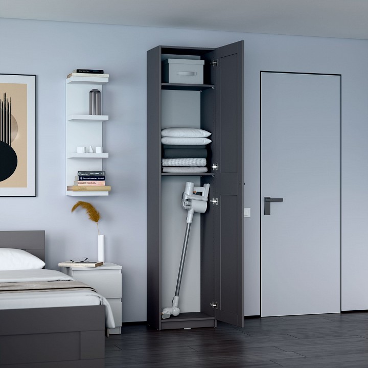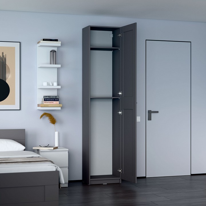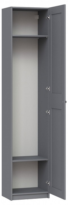 Шкаф МАКС для одежды однодверный, 500х380х2330, цвет серый. Дверь может быть установлена как с правым, так и с левым открыванием. Укомлектован двумя полками. Изготовлен из кашированного ДСП толщиной 18 мм. Крепится к стене. Гарантийный срок для жилых помещений 24 месяца, для общественных помещений — 18 месяцев.