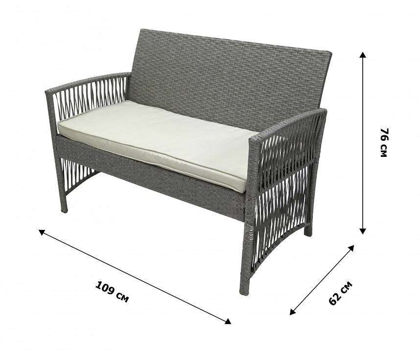 Компоненты, входящие в комплект: диван — 1090х620х760 мм стол журнальный — 750х400х380 мм 2 кресла — 580х620х760 мм