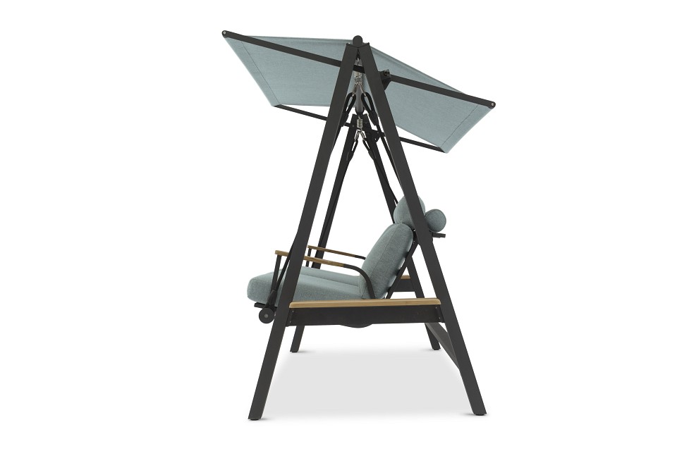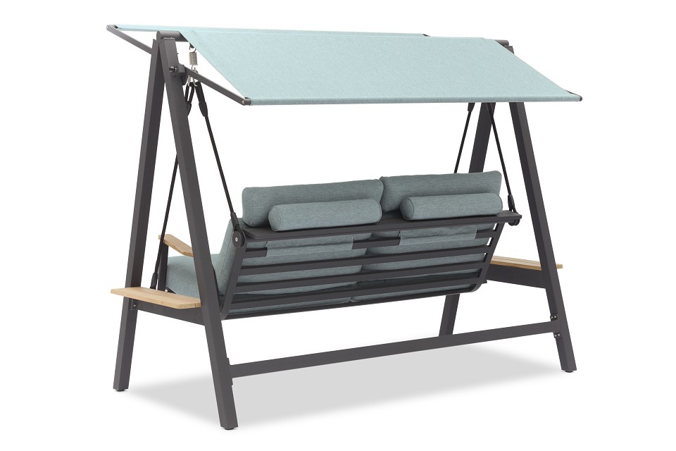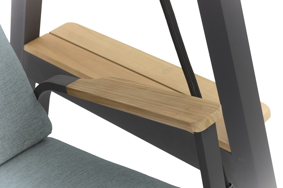 Веревки крепятся к пружинам, чтобы создать дополнительный комфорт сидения. Тент может быть установлен в 2-х разных положениях. Боковой столик из тикового дерева с обеих сторон качелей. Высокая спинка создает отличный комфорт и прекрасную поддержку головы. Алюминиевые диски, изготовленные по специальному заказу, имеют пластиковый элемент фиксации, удерживающий веревку в идеальном положении для оптимального качания. Очень удобные подушки из пенопласта с высокой эластичностью и покрытые олефиновой тканью с подкладкой, которая делает их водоотталкивающими.