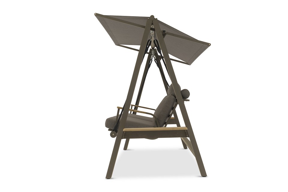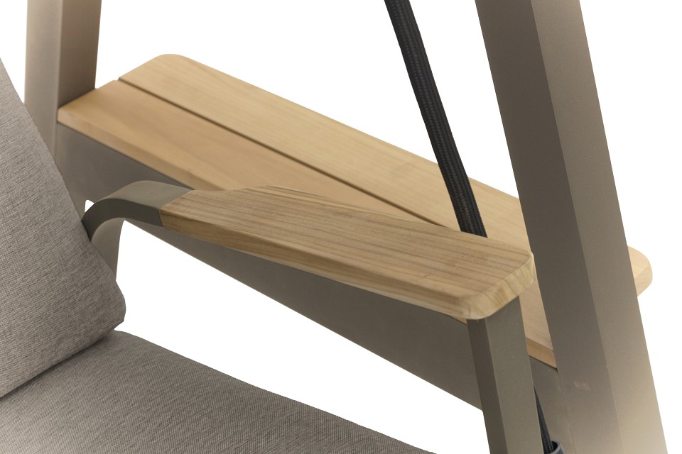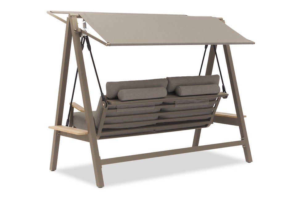 Веревки крепятся к пружинам, чтобы создать дополнительный комфорт сидения. Тент может быть установлен в 2-х разных положениях. Боковой столик из тикового дерева с обеих сторон качелей. Высокая спинка создает отличный комфорт и прекрасную поддержку головы. Алюминиевые диски, изготовленные по специальному заказу, имеют пластиковый элемент фиксации, удерживающий веревку в идеальном положении для оптимального качания. Очень удобные подушки из пенопласта с высокой эластичностью и покрытые олефиновой тканью с подкладкой, которая делает их водоотталкивающими.