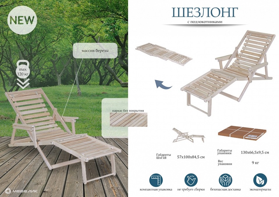 Раскладной шезлонг с подлокотниками – всё, что необходимо для комфортного отдыха на свежем воздухе. Конструкция полностью выполнена из экологически чистого материала – массива берёзы. В собранном виде модель занимает минимальное количества места. Шезлонг удобно брать с собой в поход или на пляж. Кроме того, вес лежака довольно небольшой, поэтому его легко переносить. Шезлонг с подлокотниками станет рациональной покупкой для тех, у кого есть загородный дом или дача, а также для любителей отдыха на природе. Угол наклона спинки меняется.