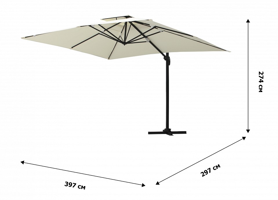 Дополнительные параметры: длина крыши — 2970 мм, высота стойки максимальная — 2700 мм (стойка регулируется по высоте для этого предназначены отверстия на стойки), толщина стойки — 80х40 мм; от пола до крыши зонта ( макс поднятие) — 2020 мм; от пола по центру зонта до верхней точки купола — 2700 мм, глубина конструкции внутри зонта по центру — 550 мм, толщина спицы — 25х15 мм, ветровая нагрузка — 5,5-7,9 м/с, подставка в комплект не входит, обязательное условие эксплуатации зонта — противовес из 4-х бетонных тротуарных плит
